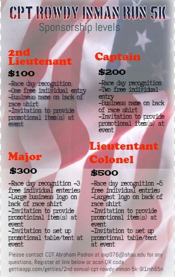 For information in regards to sponsorship please reference the flyers included. Please contact CDT Abraham Padron at axp076@shsu.edu with any additional questions.