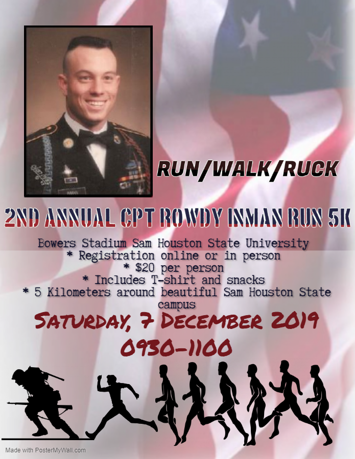 This run is in remembrance of Captain Rowdy J. Inman, a Sam Houston State University alumnus who paid the ultimate sacrifice on 26 December 2007. Captain Rowdy was the first SHSU ROTC graduate to die in combat while he was with the US 3rd Armored Calvary Regiment during Operation Iraqi Freedom. Captain Inman was also a veteran of Operation Desert Storm and Operation Just Cause, earning many accommodations including the bronze star with oak leaf cluster, the purple heart, and the meritorious service medal with oak leaf cluster.